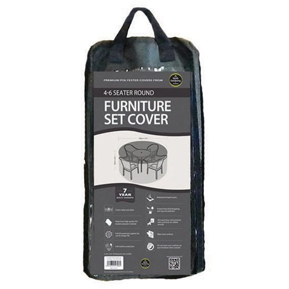This furniture cover is the perfect way to protect your table and chairs from the elements. A premium furniture cover made for 4-6 seater round furniture sets, this cover is made from a high quality premium PVC backed polyester material. This cover comes with a 7 year warranty. The dimensions of this cover are: Diameter 188cm Height 89cm
