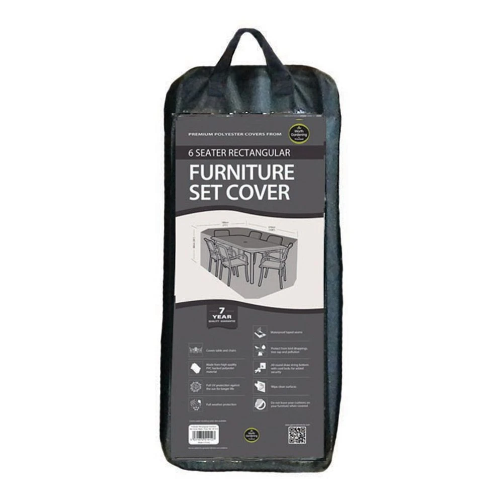 This furniture cover is the perfect way to protect your table and chairs from the elements. A premium furniture cover made for 6 seater rectangular furniture sets, this cover is made from a high quality premium PVC backed polyester material. This cover comes with a 7 year warranty. The dimensions of this cover are: Length 270cm Width 180cm Height 89cm