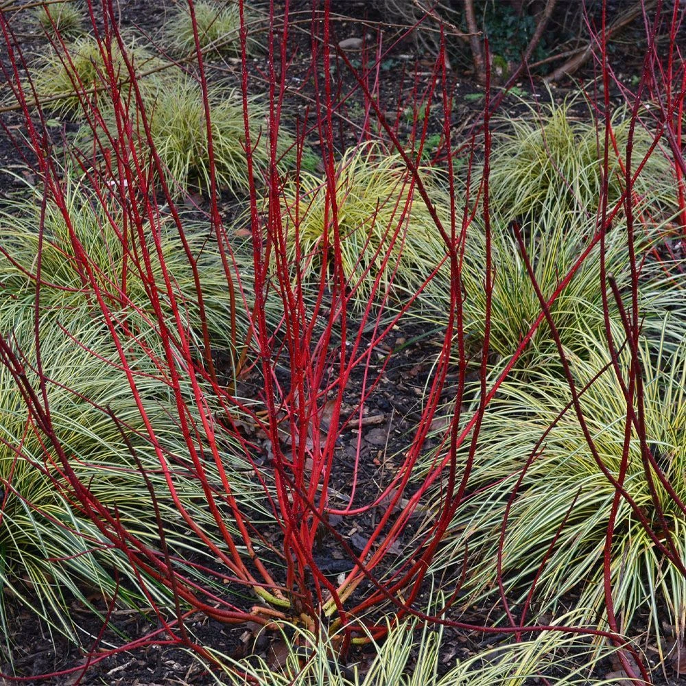 Cornus alba Baton Rouge is a fantastic, deciduous shrub grown mainly for it’s stunning stems that add interest to your garden in autumn and winter. In spring green foliage covers the stem while in late summer berries are produced that attract birds into your garden. The gorgeous red stems turn a bright crimson in winter that helps keep your garden bright and vibrant. This plant enjoys a position in full sun to partial shade with moist but well-drained soil. The potential height of this cornus is 1.5 metres and the potential spread is 1.5 metres.