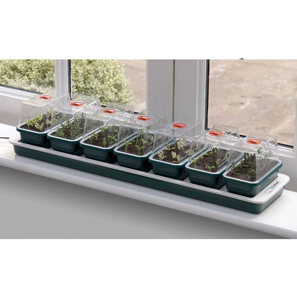 This Electric Windowsill Propagator is the ideal solution to cold or draughty windowsills. Providing your seedlings with the heat, light and protection from cold and draughts that they need to grow into strong healthy plants. The 13 Watt carbon fibre element distributes heat evenly across all 7 mini propagators, increasing the compost temperature by approximately 8 degrees centigrade. Each of the mini propagators has its on ventilation so this kit provides you with the flexibility to grow a varied selection on plants in just one unit.